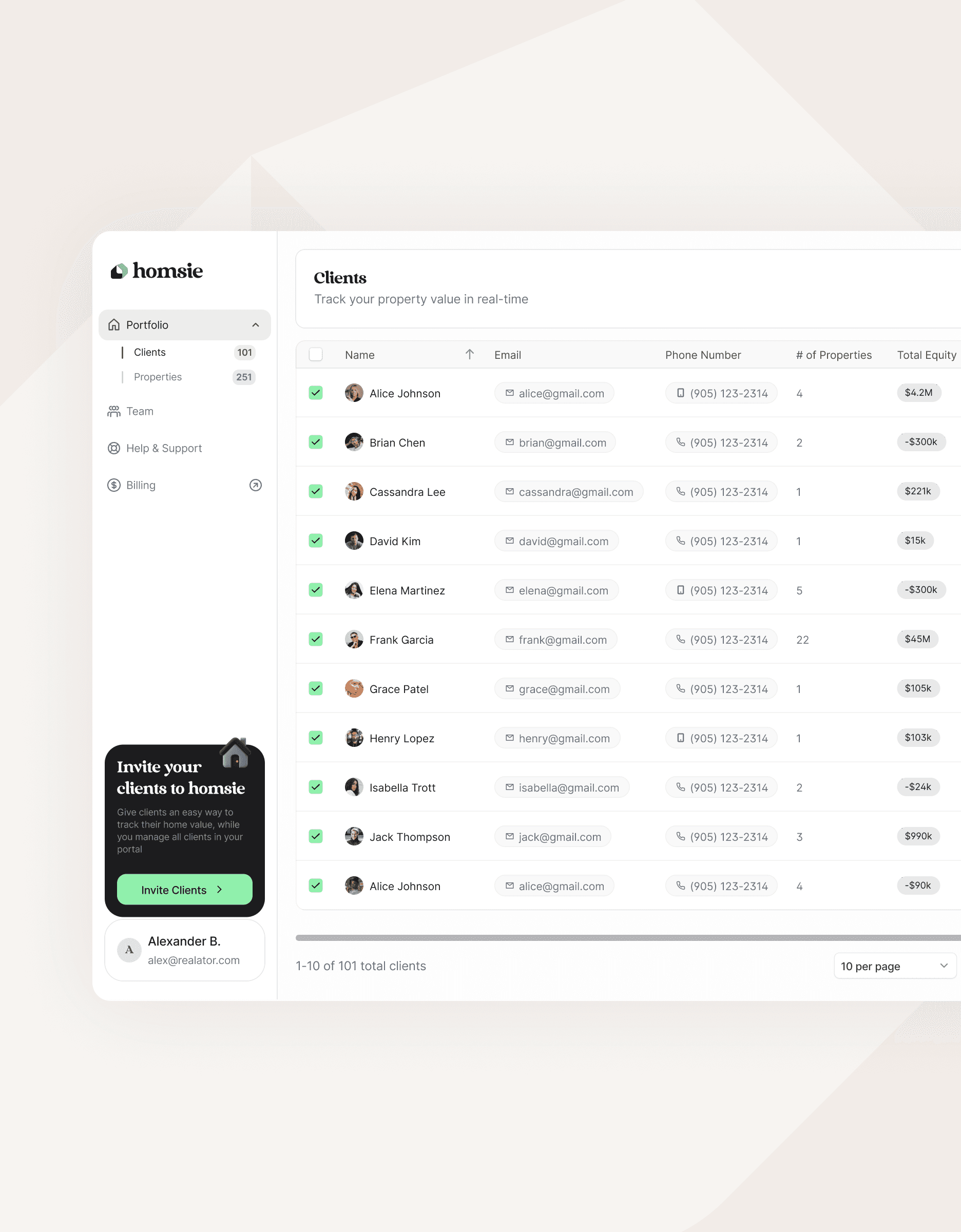 The Client View gives you a live, organized view of every homeowner in your database. Instead of relying on scattered notes, outdated CRMs, or relying on memory you see each client's real estate position clearly to see who might be ready to move, refinance, or invest — powered entirely by first-party data.